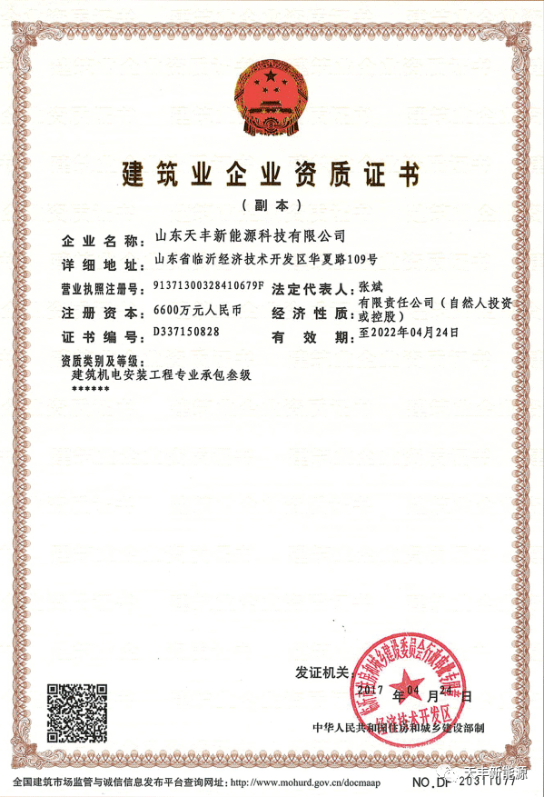 天豐新能源在全國范圍內已先后取得山東、河南、河北、安徽、山西等十余個省市及100余個地市的認證備案證書或推廣證書。