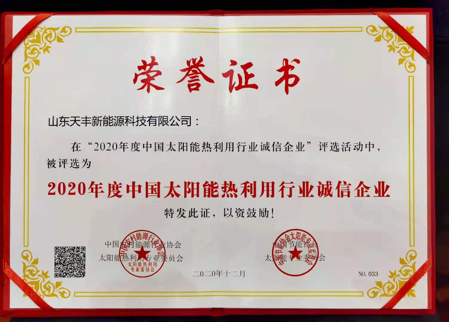 12月8日,2020年中國太陽能熱利用行業年會在邢臺召開,山東天豐新能源科技有限公司受邀參加本次會議,在會上,天豐新能源再度蟬聯“中國太陽能熱利用行業誠信企業”稱號,并獲頒榮譽證書。