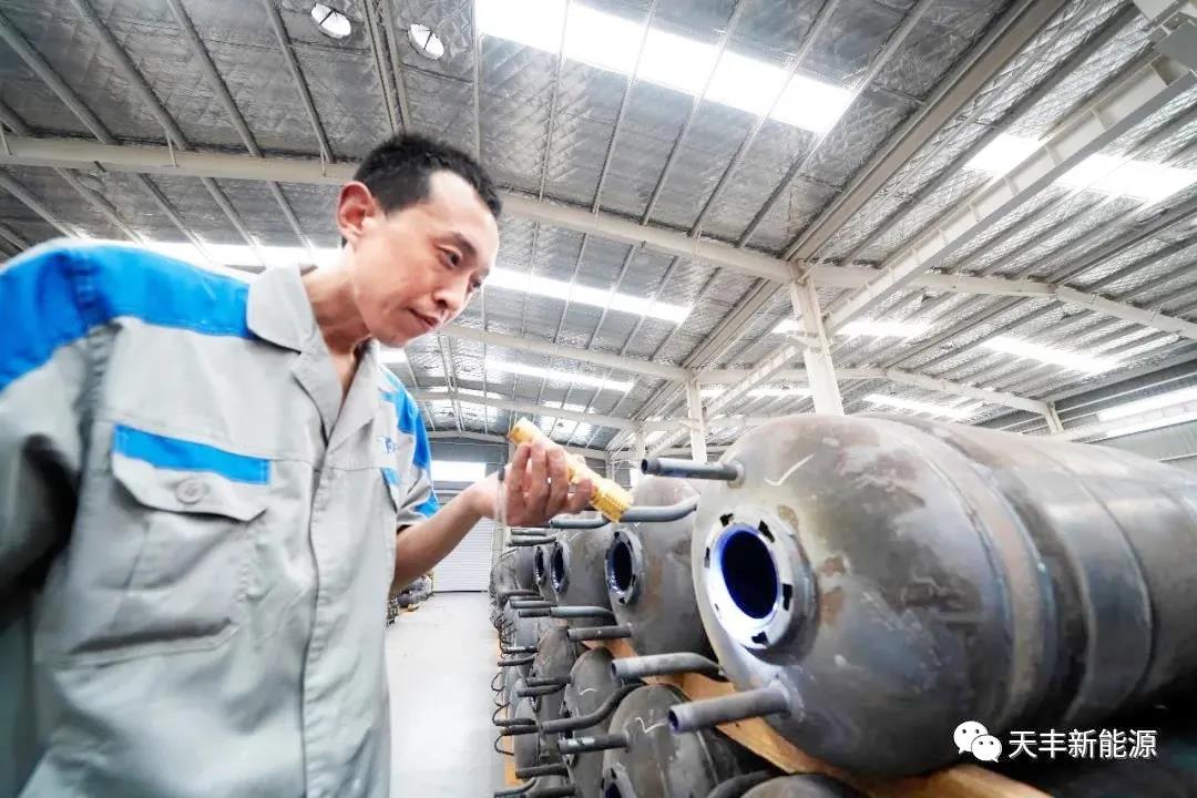 為了保證產品質量,天豐公司要求每臺產品都要進行1.0兆帕的氣密性試驗,從而確保每臺出廠產品都是合格品,達到“0不良”的成效。由公司專門研發的多工位碼垛試壓一體機,集碼垛、轉運、翻轉、試壓等功能于一體,能夠快速高效的實現內膽的試壓、碼垛、轉運、翻轉等工作,提升了工作效率。