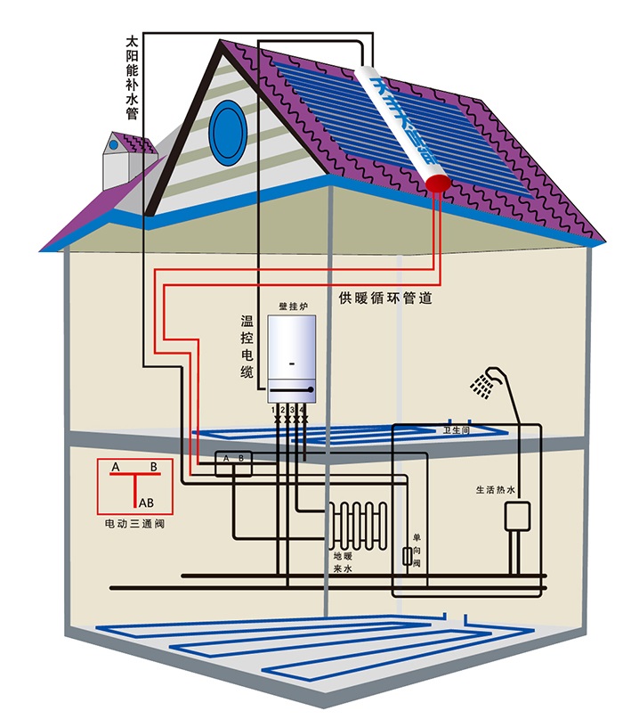 本系統(tǒng)是將太陽能轉換成熱能,供給建筑物冬季采暖和全年其他用熱的系統(tǒng),其供暖末端采用的是地板輻射采暖系統(tǒng),適應各種房型采暖及生活熱水供應。
